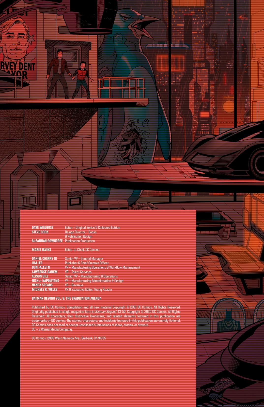 In the final volume of Batman Beyond, Batman and Batman Beyond meet at least, with Booster Gold caught in the middle! But first, Terry McGinnis forges an uneasy alliance with Damian Wayne in order to stop Mr. Zero and his radical faction from turning Gotham City into an ice-covered hellscape. To set things right, Batman, Damian, and Batwoman Beyond must declare war on the League of Assassins! And one more thing: Inque returns, posing as Batman and wreaking havoc in Gotham City! Collects Batman Beyond #43-50.