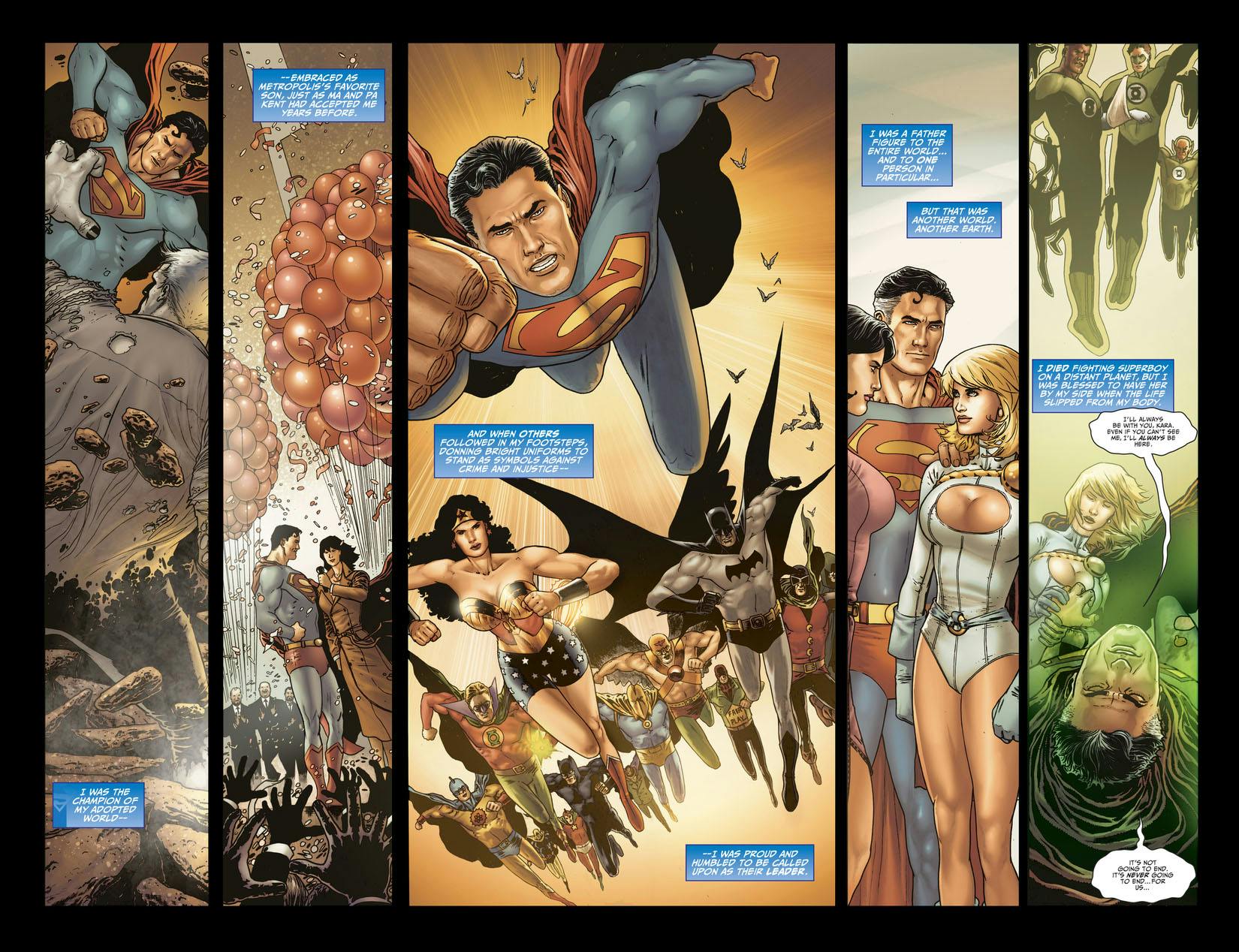 The bloodthirsty combat in Manhattan reaches its stunning conclusion here! Earth-2 Superman returns to prove that the true legacy of the Justice Society of America is death. Can our heroes rise up to defeat their dead mentors, role models and villains? And can even the third-smartest man in the world, Mr. Terrific, devise a way to destroy them—or will Manhattan and the world perish under Nekron's might?