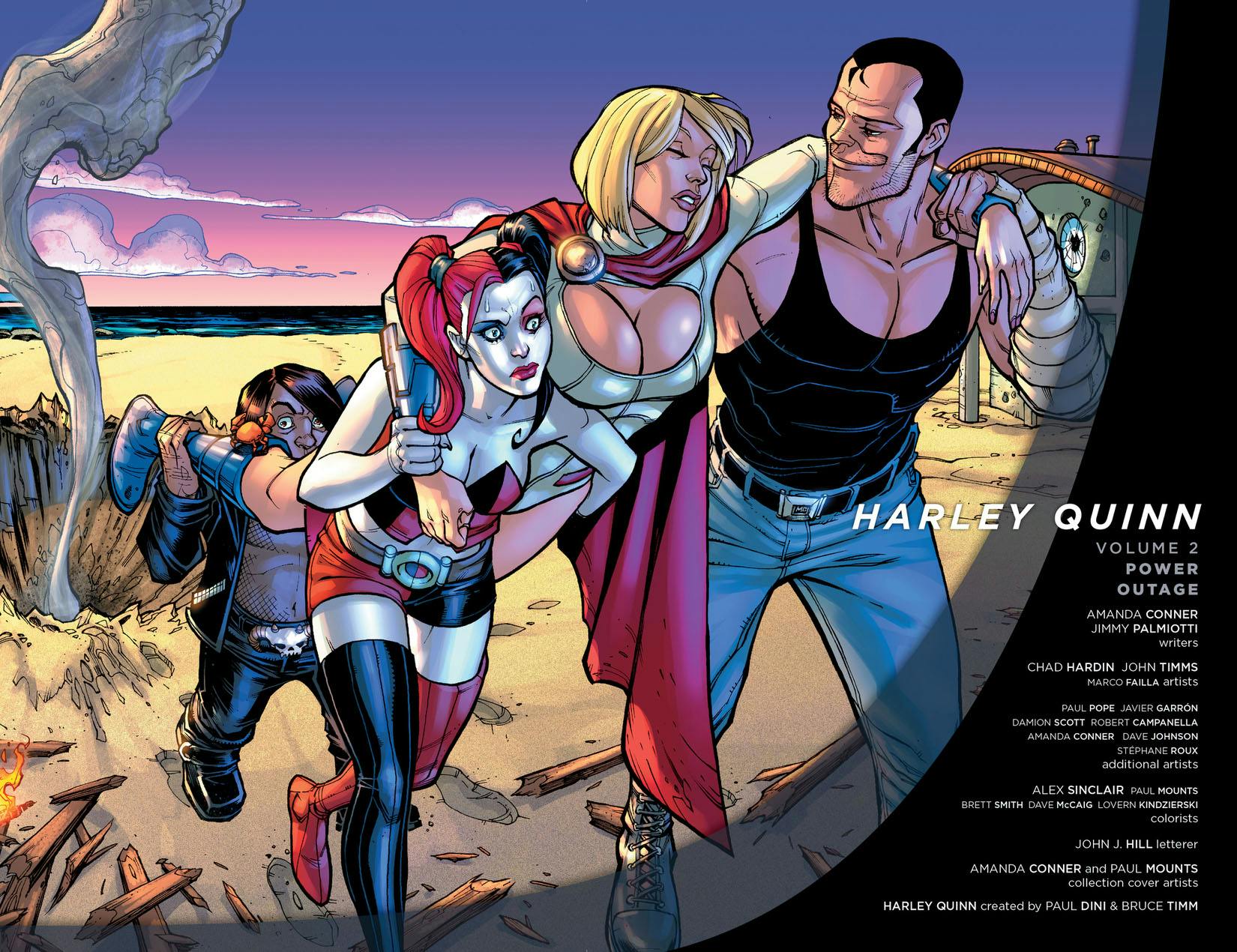 When bona fide superhero Power Girl drops outta the sky and into Harley Quinn’s new Coney Island ’hood, there’s only one thing for the former moll to do: Sew herself a new costume so the amnesiac Power Girl believes they’re a pair of crime-fighting superheroines! But how long can Harley keep up the act now that she’s pretending to be on the straight-and-narrow? PLUS! A look into the future of the greatest power couple in crime, as Harley and the Joker are reunited in FUTURE'S END! DOUBLE PLUS! Harley puts the "con" back in "Comic-Con" with a wild trip to San Diego, drawn by Paul Pope, Dave Johnson, and a Hall H full of crazy talented artists! Writers Amanda Conner and Jimmy Palmiotti and artists Chad Hardin & John Timms present HARLEY QUINN VOL. 2: POWER OUTAGE—more madcap adventures starring the Brooklyn bombshell herself! Collects HARLEY QUINN #9-13, HARLEY QUINN FUTURES END #1 and HARLEY QUINN INVADES COMIC-CON INTERNATIONAL SAN DIEGO #1.