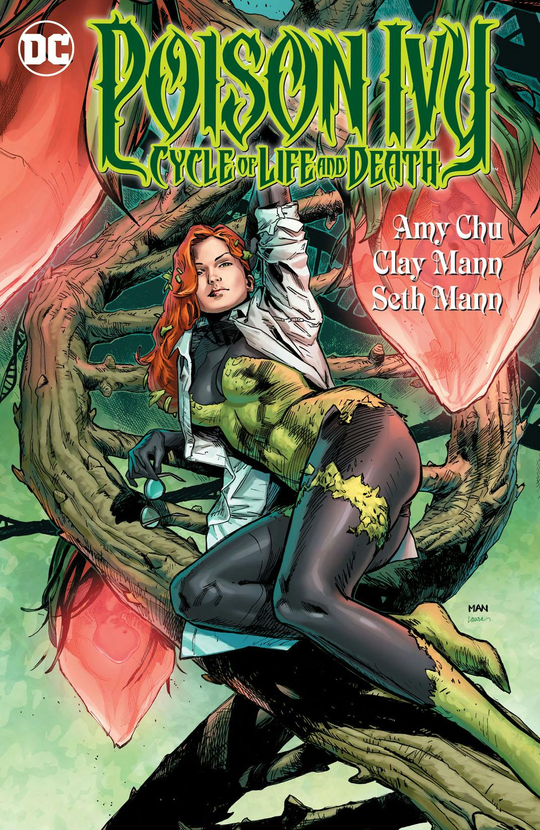 POISON IVY BLOSSOMS INTO HER FIRST SOLO ADVENTURE! There’s animal. There’s vegetable. And there’s somewhere in between. That’s where Dr. Pamela Isley, a.k.a. Poison Ivy, finds herself. Instead of battling the Dark Knight, she is now a researcher at the Gotham Botanical Gardens, studying the possibility of creating plant-human hybrids. But when her fellow scientists start turning up dead, she’s both the natural leading suspect…and the only person (or plant) who can crack the case. To solve the mystery, Poison Ivy must team up-or throw down-with her oldest friends and closest frenemies, from Harley Quinn to Catwoman to the Swamp Thing. Can she keep things under control, or will she be responsible for a deadly new harvest? Find out in POISON IVY: CYCLE OF LIFE AND DEATH. Sprouting from the brains of the up-and-coming creative team of writer Amy Chu and artist Clay Mann, it’s a mean, green murder mystery starring one of Batman’s greatest rogues! Collects POISON IVY: CYCLE OF LIFE AND DEATH #1-6.