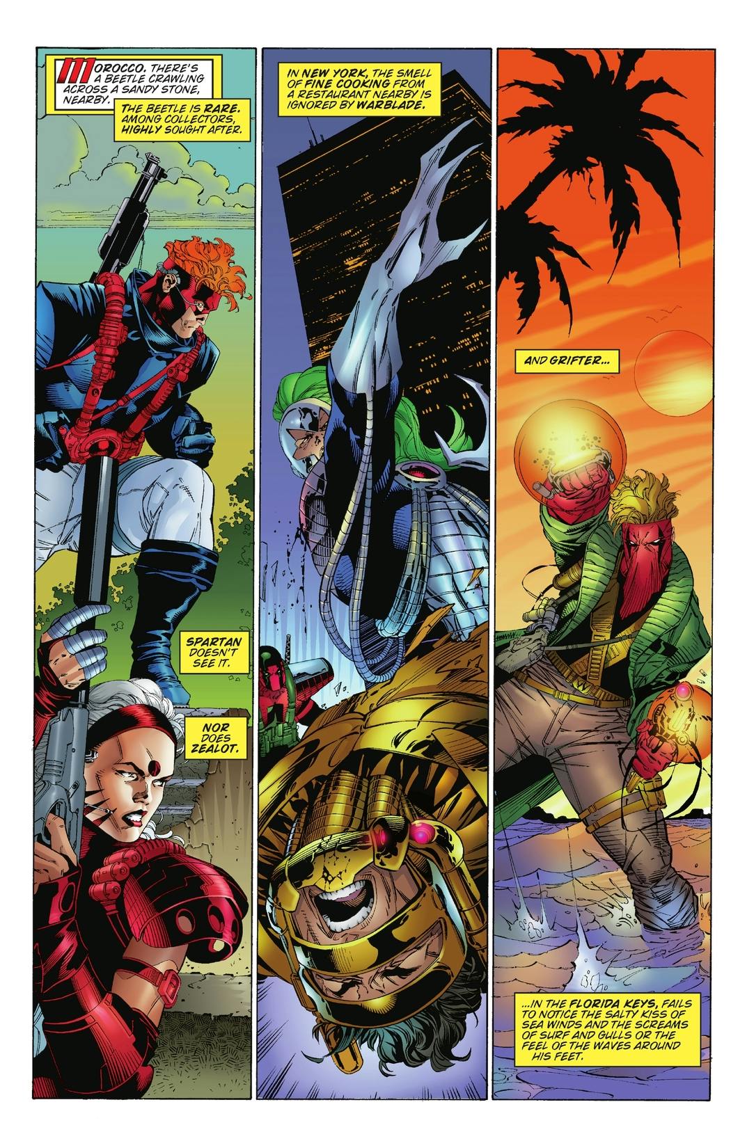 After learning last issue that their friend and teammate had been replaced by the Daemonite shape-shifter Mr. White, the WildC.A.T.s desperately search for the real Maul. Splitting up to hit multiple Cabal bases at once, Spartan, Zealot, Grifter, and Warblade demand answers at sword- and gunpoint, while Void attempts to end their search by physically entering the computer realm!